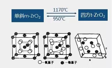 ZrO2四方相與單斜相之間的轉(zhuǎn)變是馬氏體相變,由于四方相轉(zhuǎn)變?yōu)閱涡毕鄷r有 3~5%的體積膨脹和 7~8%的切應(yīng)變。因此,純 ZrO2 制品往往在生產(chǎn)過程(從高溫到室溫的冷卻過程)中會發(fā)生 t-ZrO2 轉(zhuǎn)變?yōu)?m-ZrO2 的相變并伴隨著體積變化而產(chǎn)生裂紋,甚至碎裂,因此無多大的工程價值。