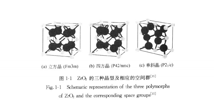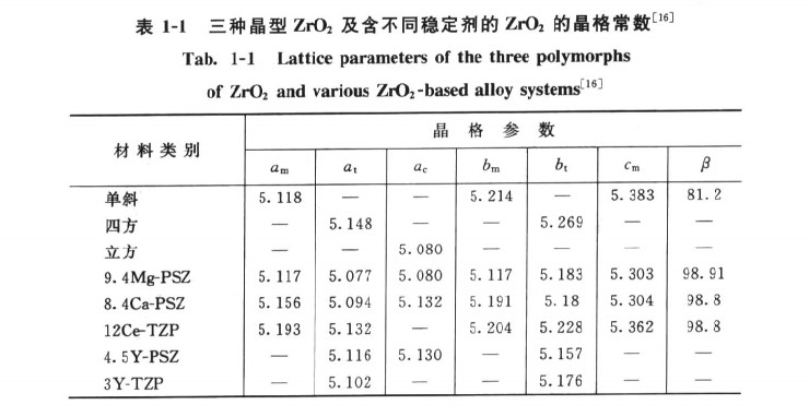 三種晶型的氧化鋯及含不同穩(wěn)定劑的氧化鋯的晶格常數見表1-1