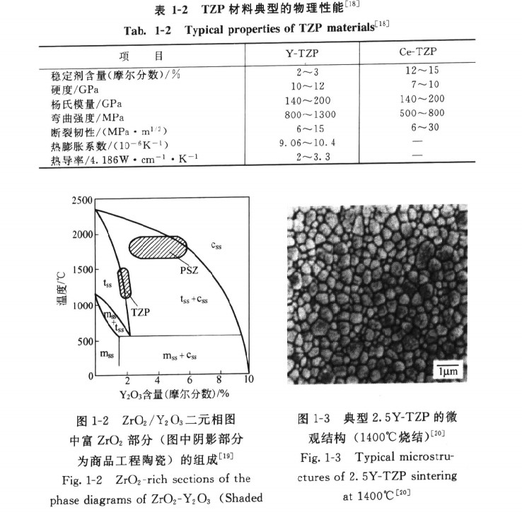 其中TZP是ZTC材料中室溫力學(xué)性能最高的一種材料(其力學(xué)性能見(jiàn)表1-2181),TZP中又以Y2O2作為穩(wěn)定劑的Y-TZP應(yīng)用最為廣泛。TZP材料的制備以相圖(圖1-2)作指導(dǎo)19,穩(wěn)定劑Y2O3的含量在1.75%~3.5%(摩爾分?jǐn)?shù))范圍變化。t-ZrO2的含量取決于組成、燒燒結(jié)溫度和時(shí)間般在60%~100%之間變化。典型的TZP材料徵觀結(jié)構(gòu)為粒徑為0.5~2m的等軸晶組成的均勻組織21(如圖1-3所示)。當(dāng)原料中含有異類組分(如SiO2)時(shí),在界面上往往存在由異類組分和Y2O3組成的玻璃相。
