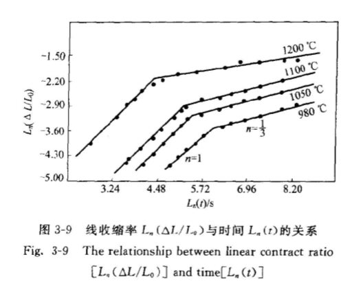 即線收縮率△L/La正比于時間t。根據(jù)普通粉體以擴散傳質(zhì)為主的固相燒結模型,初期燒結的動力學關系為△L/ L=kt對于不同的擴散傳質(zhì)機理,式中指數(shù)n取值在2.5~5之間變化。