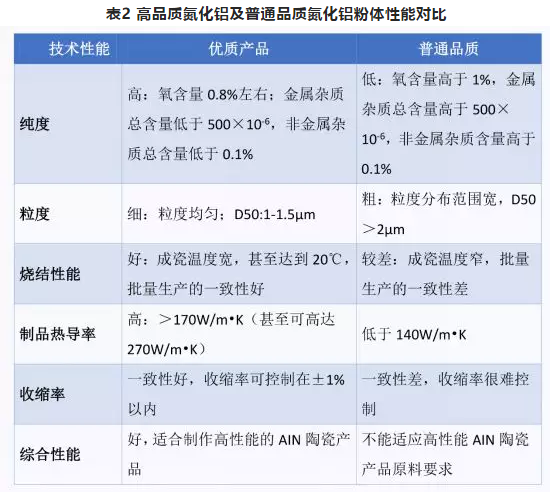 這其中日本德山曹達(dá)公司采用的氧化鋁粉碳熱還原法生產(chǎn)的AIN粉被全球公認(rèn)為質(zhì)量最好,性能最穩(wěn)定,基本占據(jù)了AIN粉市場。日本東芝,京瓷公司,住友電子等大部分基板和封裝都在使用該AIN粉。此外,美國DOW化學(xué)公司也掌握了氧化鋁粉碳熱還原法生產(chǎn)AIN粉技術(shù)。日本東洋鋁公司則采用成本相對較低的鋁粉直接氮化法生產(chǎn)AIN粉,性能也挺好,熱導(dǎo)率也能穩(wěn)定在170W/m•K以上。優(yōu)質(zhì)的AIN粉及品質(zhì)一般的氮化鋁粉的區(qū)別見下表分析。