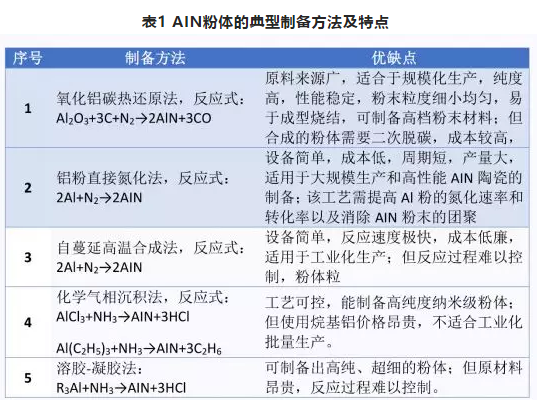 氮化鋁陶瓷的優(yōu)良性能與原材料粉體的性能有著直接的關(guān)系,高性能AIN粉體是制備高熱導(dǎo)率AIN陶瓷的關(guān)鍵。制備AIN粉體的方法有很多種(見下表1),也都存在各自的不足,但他們都有一個共同點就是成本較高。