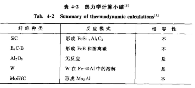 由表4-2可以看出,F(xiàn)eAI與A2O具有較好的適配性能,兩者之間無(wú)界面相形成。AAYK. MISRAZ在1990年也分析預(yù)測(cè)了以FeAl金屬間化合物為基體,陶瓷為增強(qiáng)體復(fù)合村料的熱動(dòng)力學(xué)可能反應(yīng)產(chǎn)物),分析結(jié)果見表4-3。上述結(jié)果對(duì)復(fù)合材料的設(shè)計(jì)也是非常重要的。