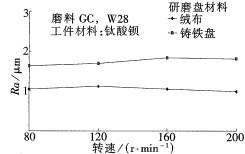 從實驗結(jié)果(見圖3)來看,磨盤材料對加工表面粗糙度有明顯的影響。使用絨布時,由于絨布的彈性拋光作用,表面粗糙度明顯低于使用鑄鐵盤。隨著轉(zhuǎn)速的提高,表面粗糙度下降。