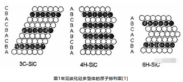 碳化硅以共價鍵為主,共價鍵約占88%。晶格的基本結(jié)構(gòu)是互相穿插的SiC4和CSi4四面體。由于四面體堆積次序的不同形成不同的結(jié)構(gòu),至今已發(fā)現(xiàn)幾百種變體,常見的結(jié)構(gòu)如3C-SiC、4H-SiC、6H-SiC等,堆積規(guī)律如圖所示。