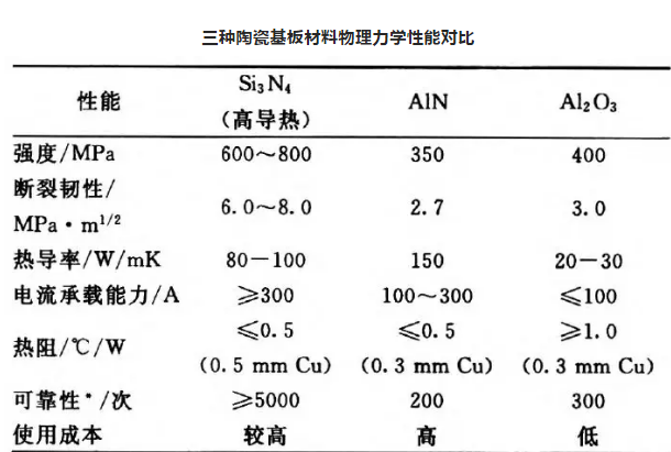 此外,氮化硅的線膨脹系數(shù)與Si、SiC和GaAs等半導(dǎo)體材料匹配良好,這使氮化硅陶瓷成為一種極具有吸引力的高強(qiáng)高導(dǎo)熱電子器件基板材料。氮化硅、氮化鋁及氧化鋁陶瓷的力學(xué)性能對比見下表。